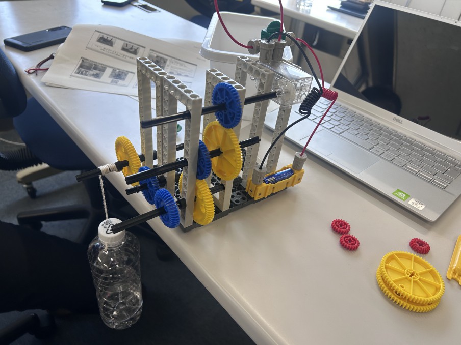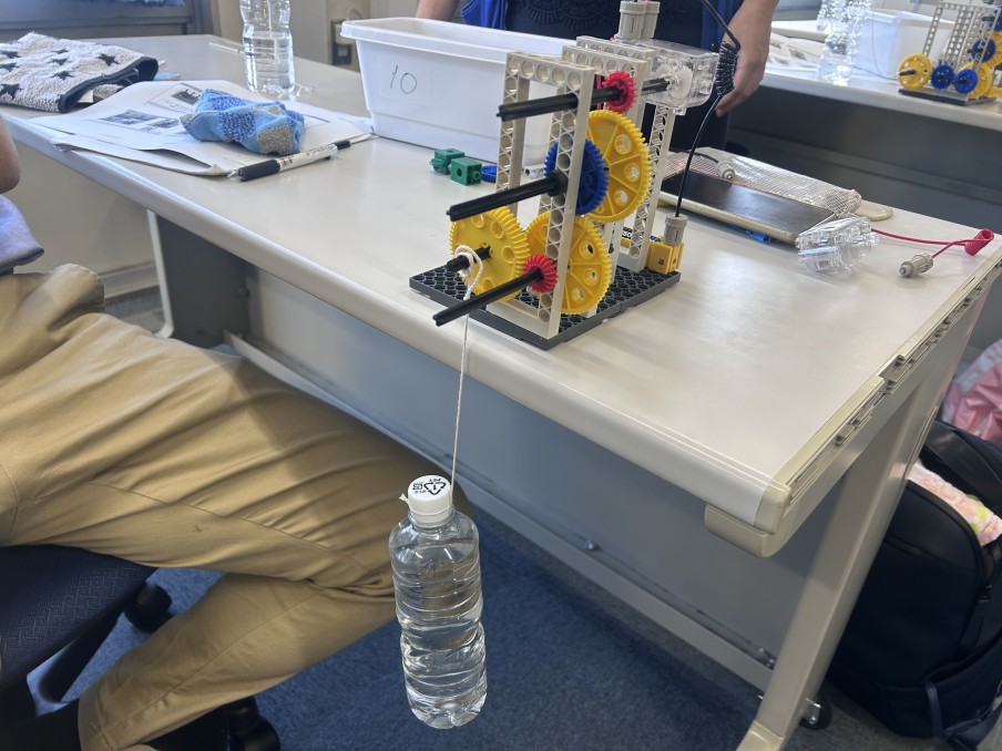 試行錯誤の末,500mlの水が満タンに入ったペットボトルを持ち上げるギヤシステムをつくっている先生もいらっしゃいました!